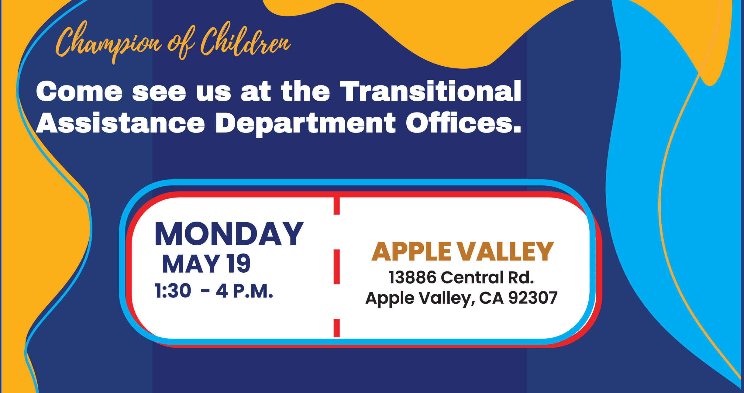 A child support specialist will be at the Transitional Assistance Office to speak with customers about the child support process and case specific inquiries. Un especialista en manutención infantil estará en la San Bernardino Transitional Assistance Department para hablar con los clientes sobre el proceso de manutención infantil y preguntas...