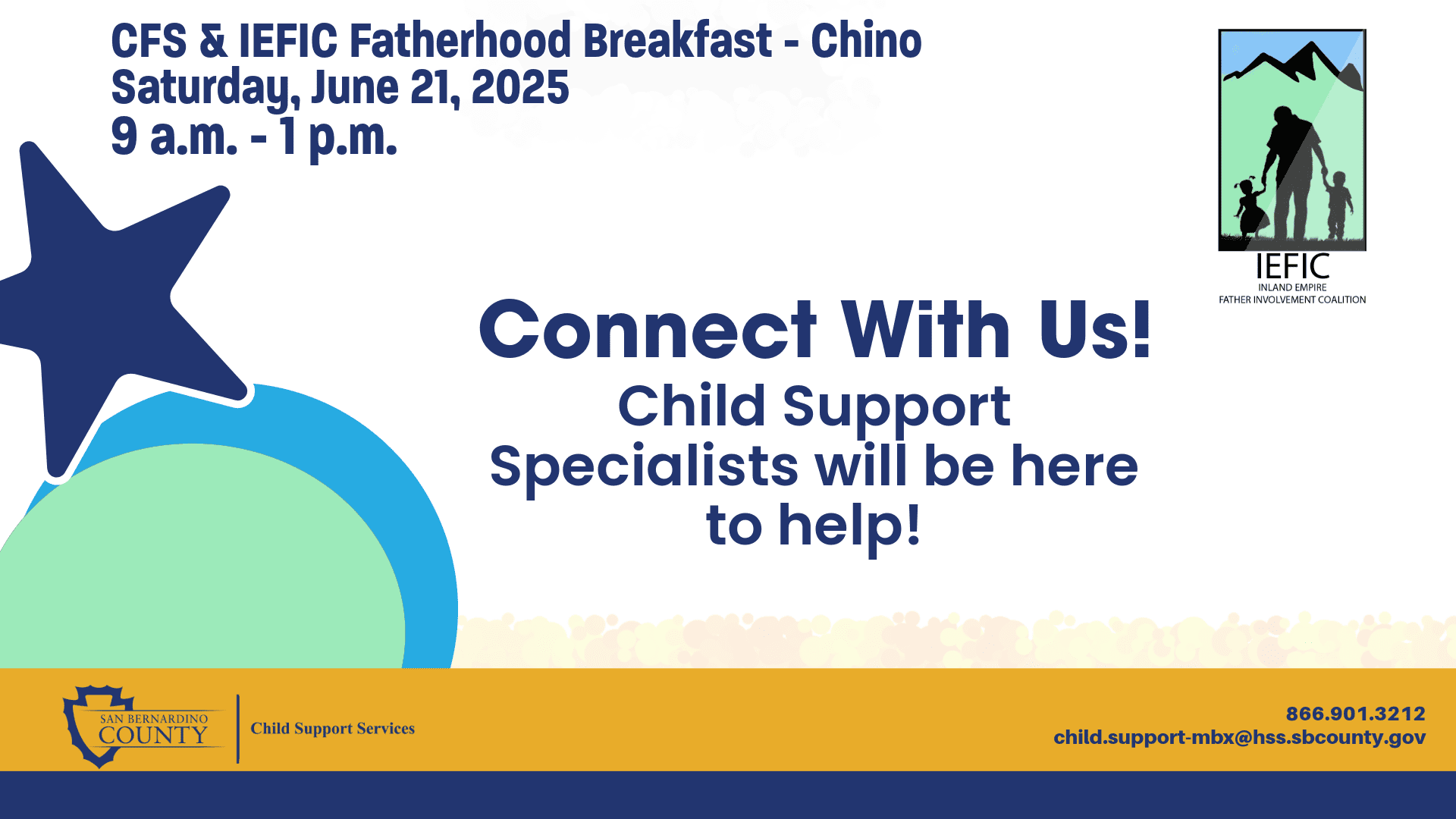 Promotional flyer for the CFS & IEFIC Fatherhood Breakfast in Chino on Saturday, June 21, 2025, from 9 a.m. to 1 p.m. Large bold text says "Connect With Us! Child Support Specialists will be here to help!" Logos for the Inland Empire Father Involvement Coalition and San Bernardino County Child Support Services are included, along with a contact phone number and email. The flyer features colorful shapes and a blue star on the left side.